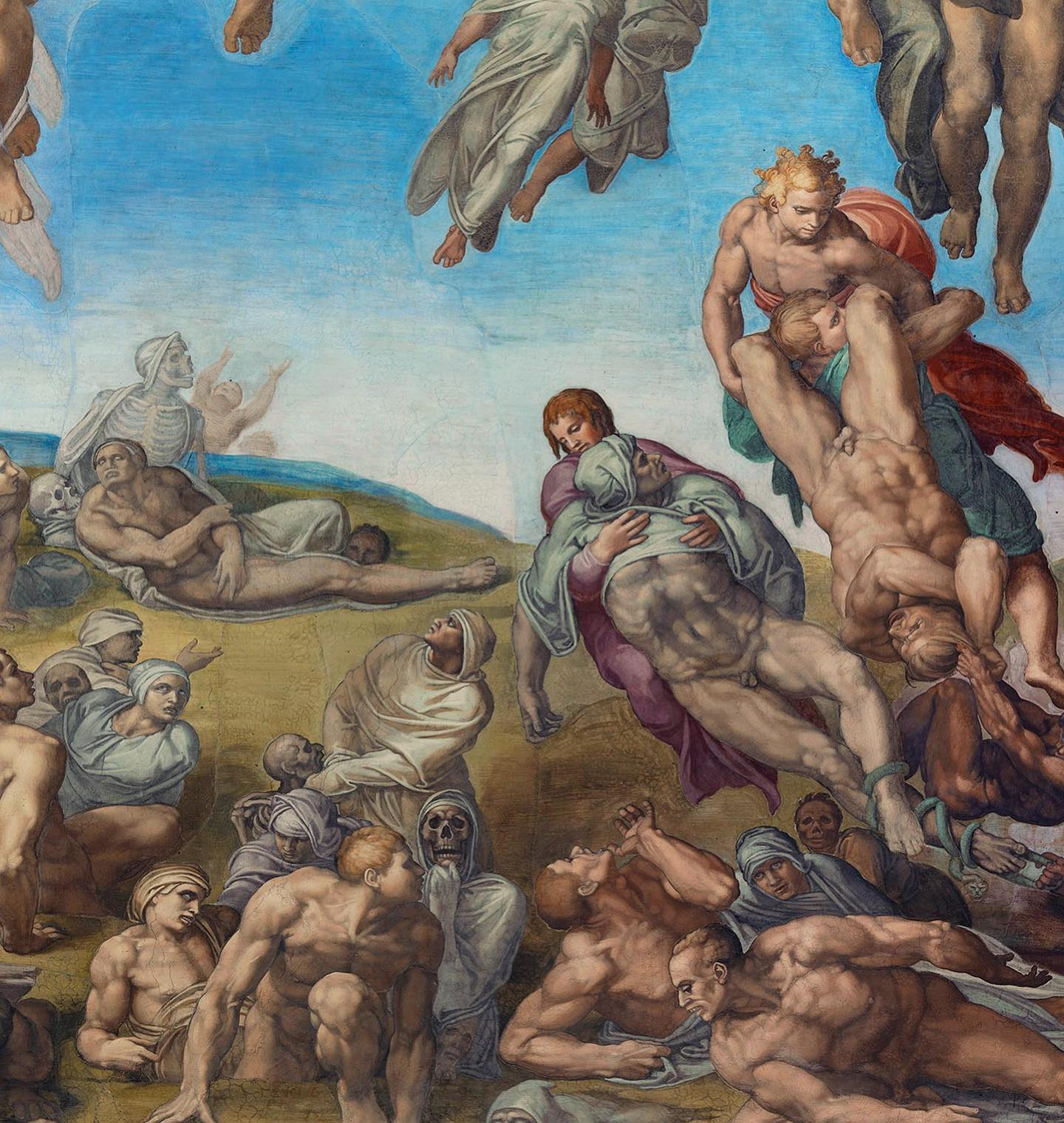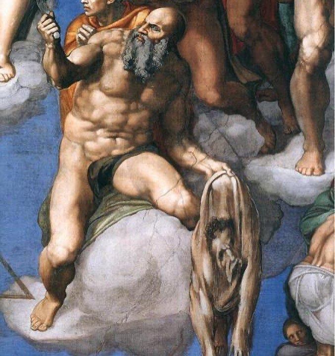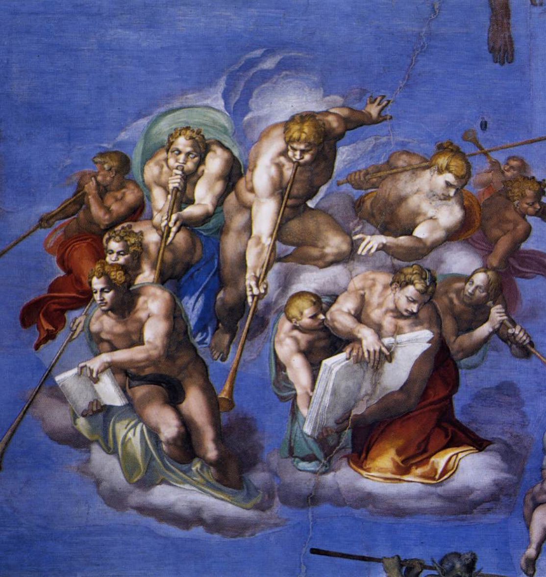 Микеланджело показывает не всех традиционных святых, не выстраивает апостолов по сторонам от Иисуса.